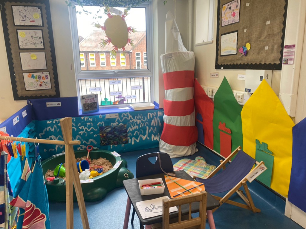 Our Role Play areas have embraced the seaside theme, with sandpits and beach huts in one classroom, a Travel Agent and checking onto an aeroplane in another and finally, a full-size Pirate Ship, complete with a mast in another!
