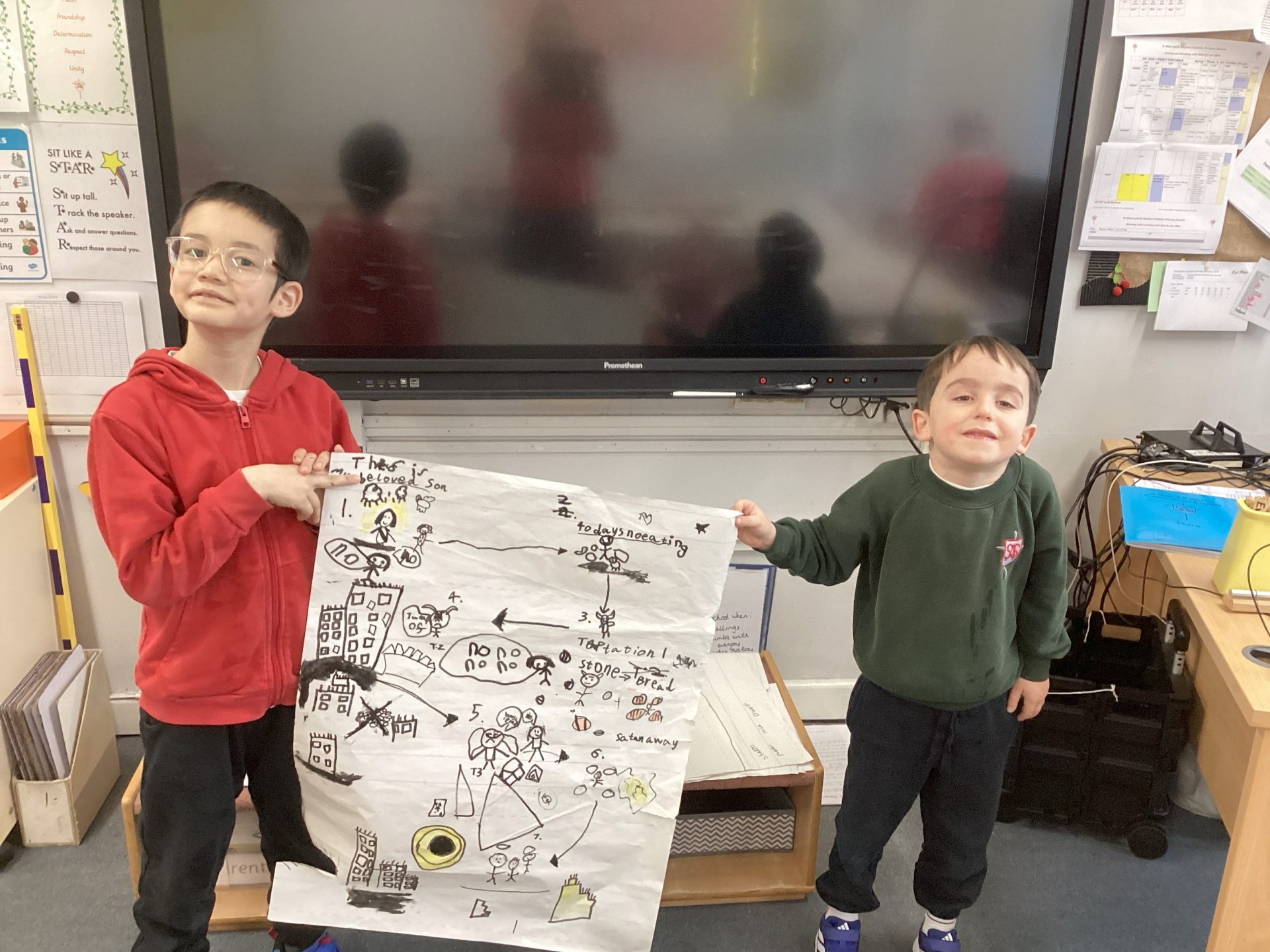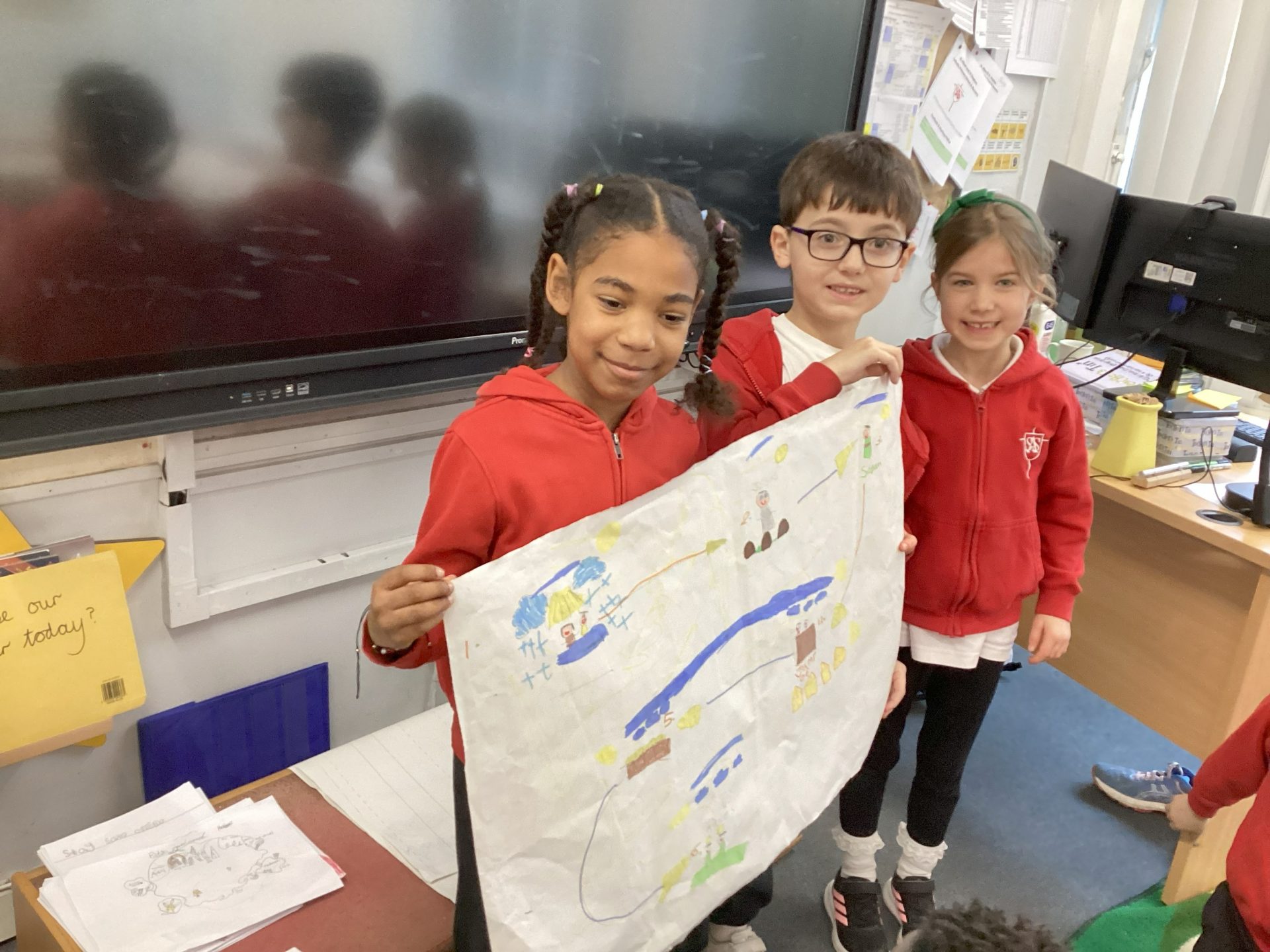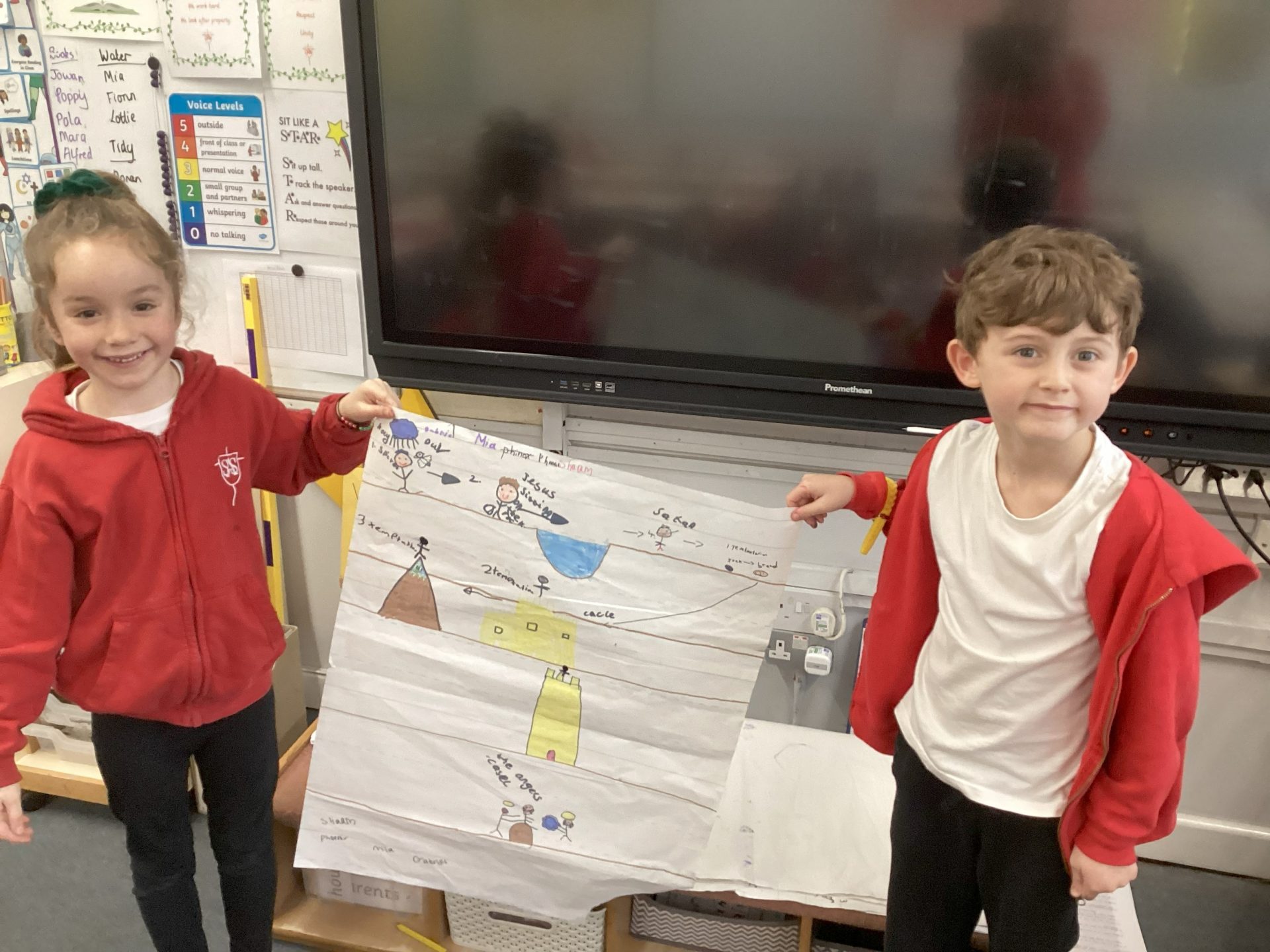 In Religious Education, we retold the story of the Baptism of Jesus. Working in groups, students crafted story maps and presented their interpretations to the class.