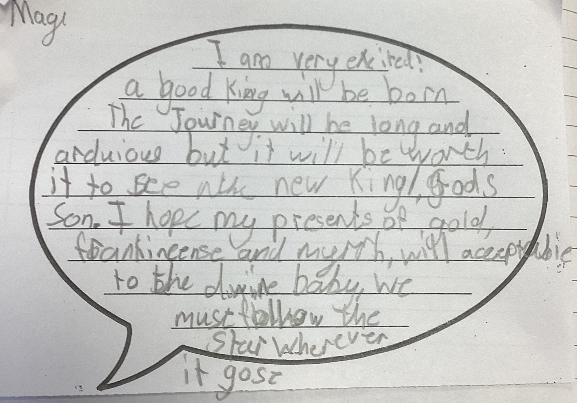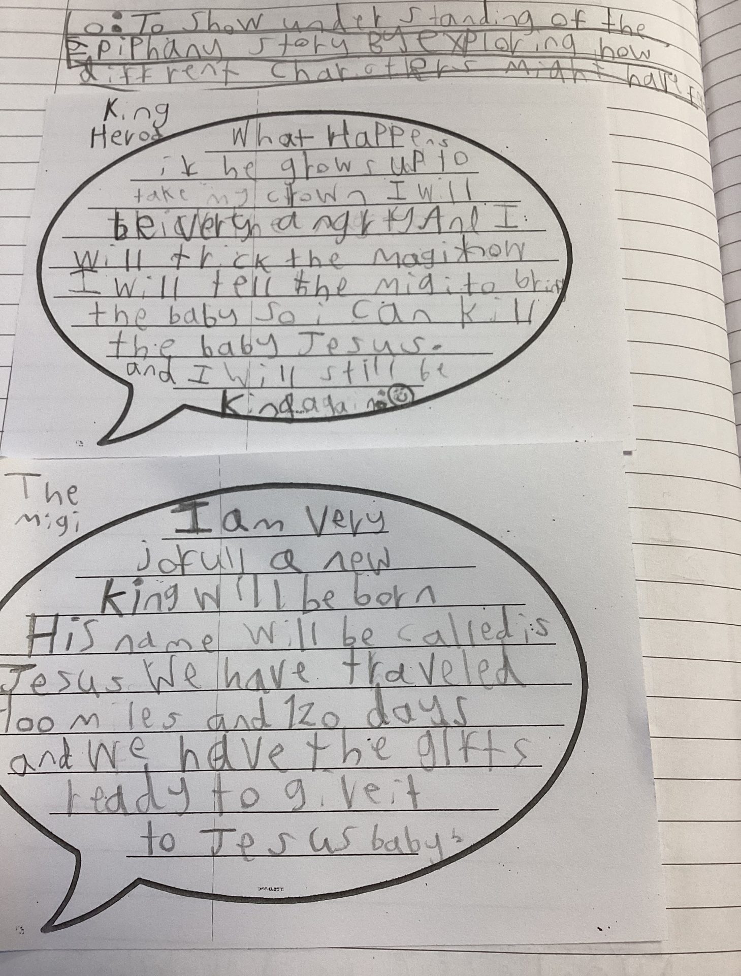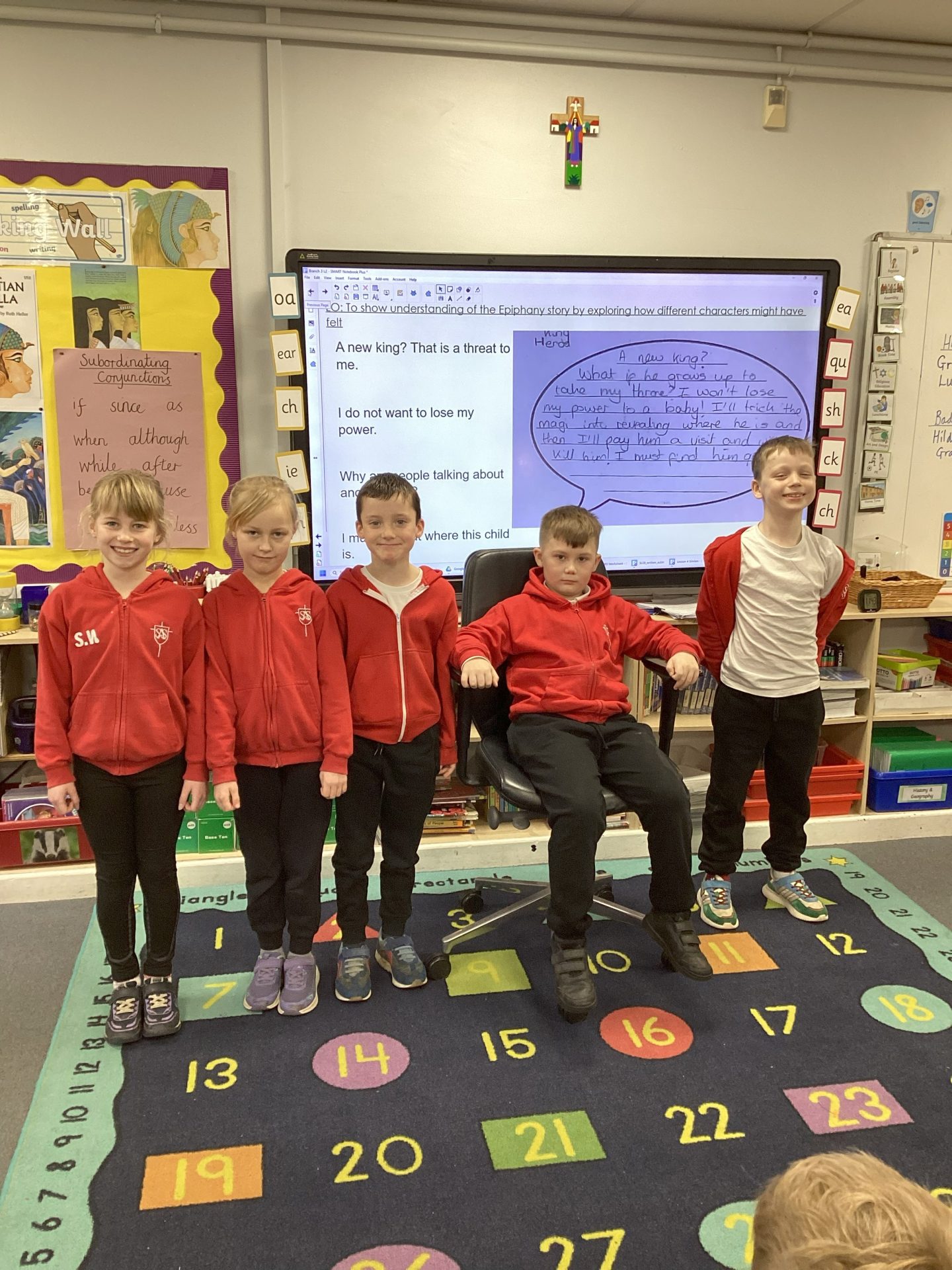 This week we began our new unit in R.E. called ‘Galilee to Jerusalem’. During one of our lessons, we performed role plays in which the children played the Magi visiting King Herod to announce the good news of the birth of the Saviour, Jesus Christ. We read Mathew 2: 1-13 detailing their arrival in Jerusalem asking for the “king of the Jews.” We learned that Herod was greatly troubled by this news and he asked the Magi to find the child and report back him so he could worship the Saviour too. However, they were warned in a dream not to return to him because of his intention to get rid of the infant Saviour. Our work helped us to understand the importance of Epiphany and the symbolism of the gifts brought by the Magi of Frankincense to denote Jesus’ holiness, Myrrh which was of symbol of his role as Saviour and gold which signified his importance as a heavenly King.