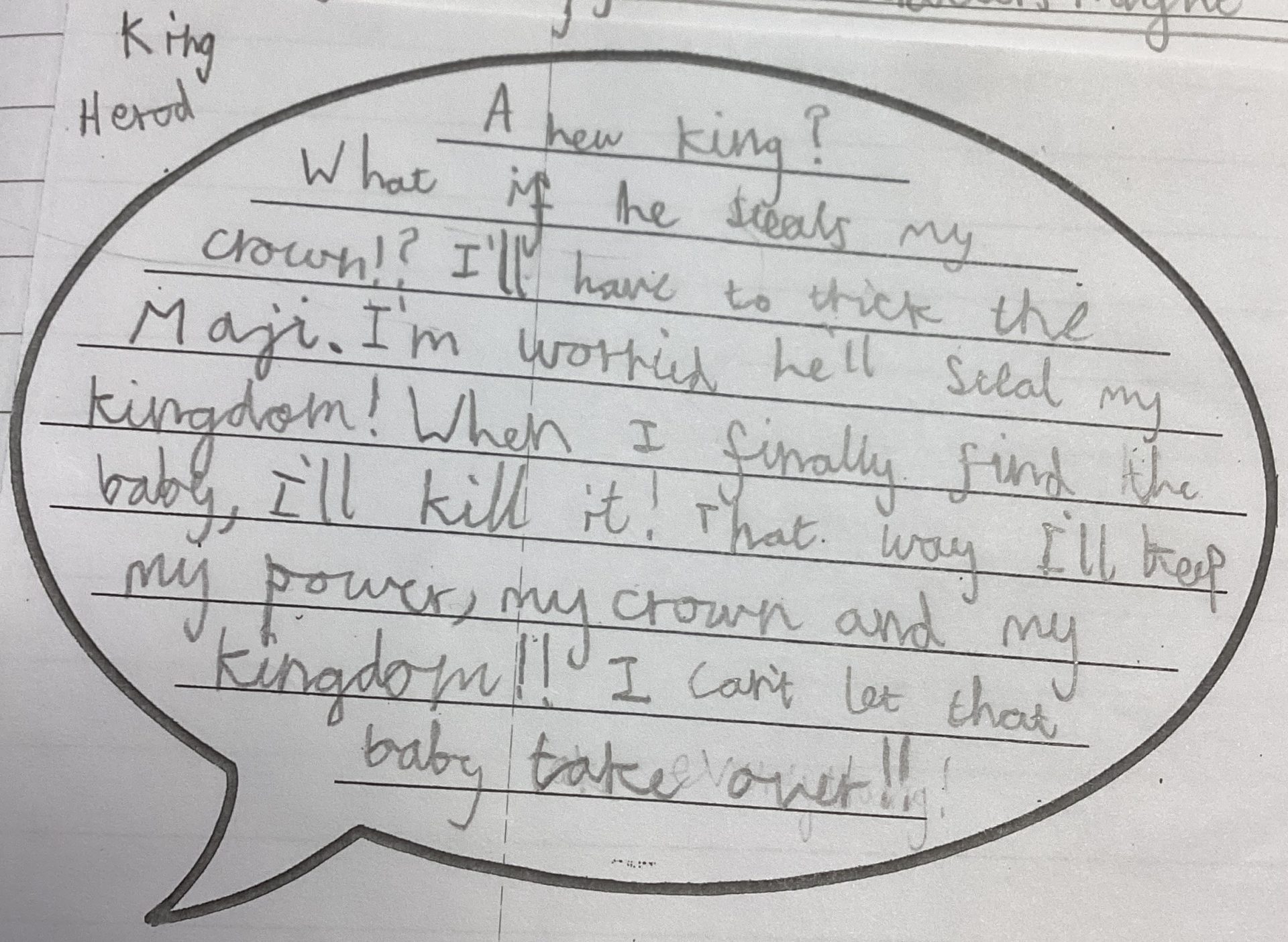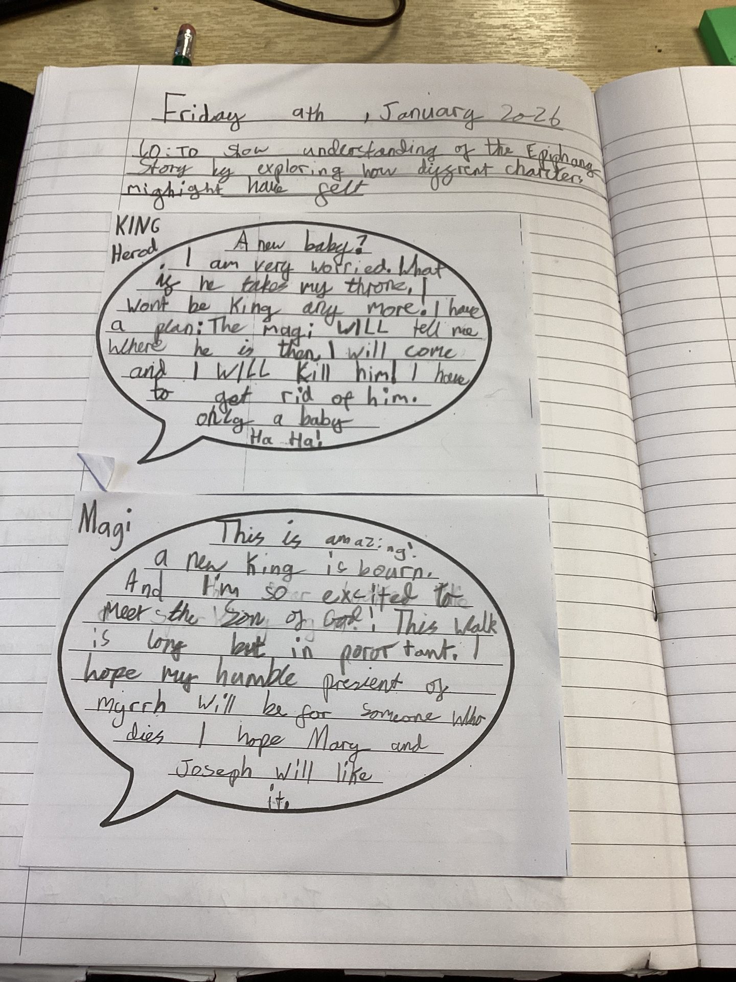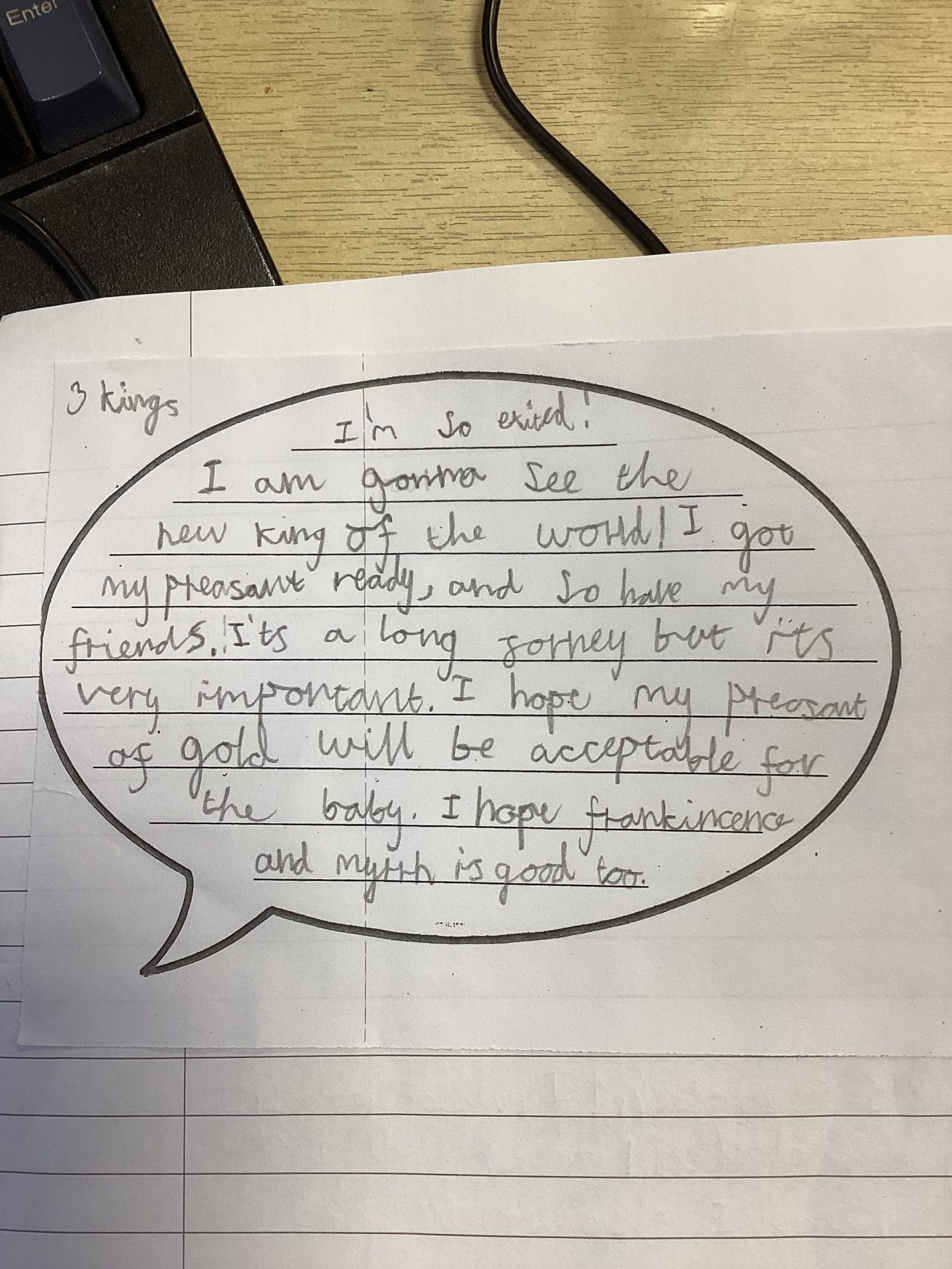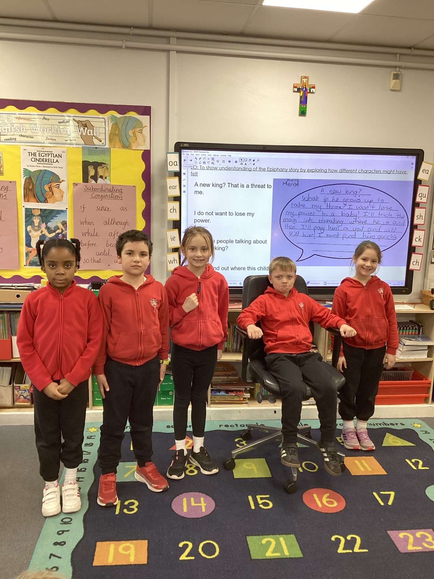 This week we began our new unit in R.E. called ‘Galilee to Jerusalem’. During one of our lessons, we performed role plays in which the children played the Magi visiting King Herod to announce the good news of the birth of the Saviour, Jesus Christ. We read Mathew 2: 1-13 detailing their arrival in Jerusalem asking for the “king of the Jews.” We learned that Herod was greatly troubled by this news and he asked the Magi to find the child and report back him so he could worship the Saviour too. However, they were warned in a dream not to return to him because of his intention to get rid of the infant Saviour. Our work helped us to understand the importance of Epiphany and the symbolism of the gifts brought by the Magi of Frankincense to denote Jesus’ holiness, Myrrh which was of symbol of his role as Saviour and gold which signified his importance as a heavenly King.