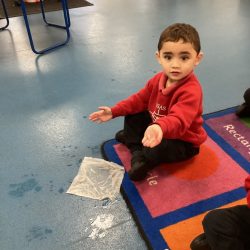 We explored Science through a simple and exciting experiment, melting an ice cube in our hands. The children talked about how it felt cold and noticed how it slowly turned into water. This hands-on activity encouraged curiosity, new vocabulary, and confidence in exploring the world around them.