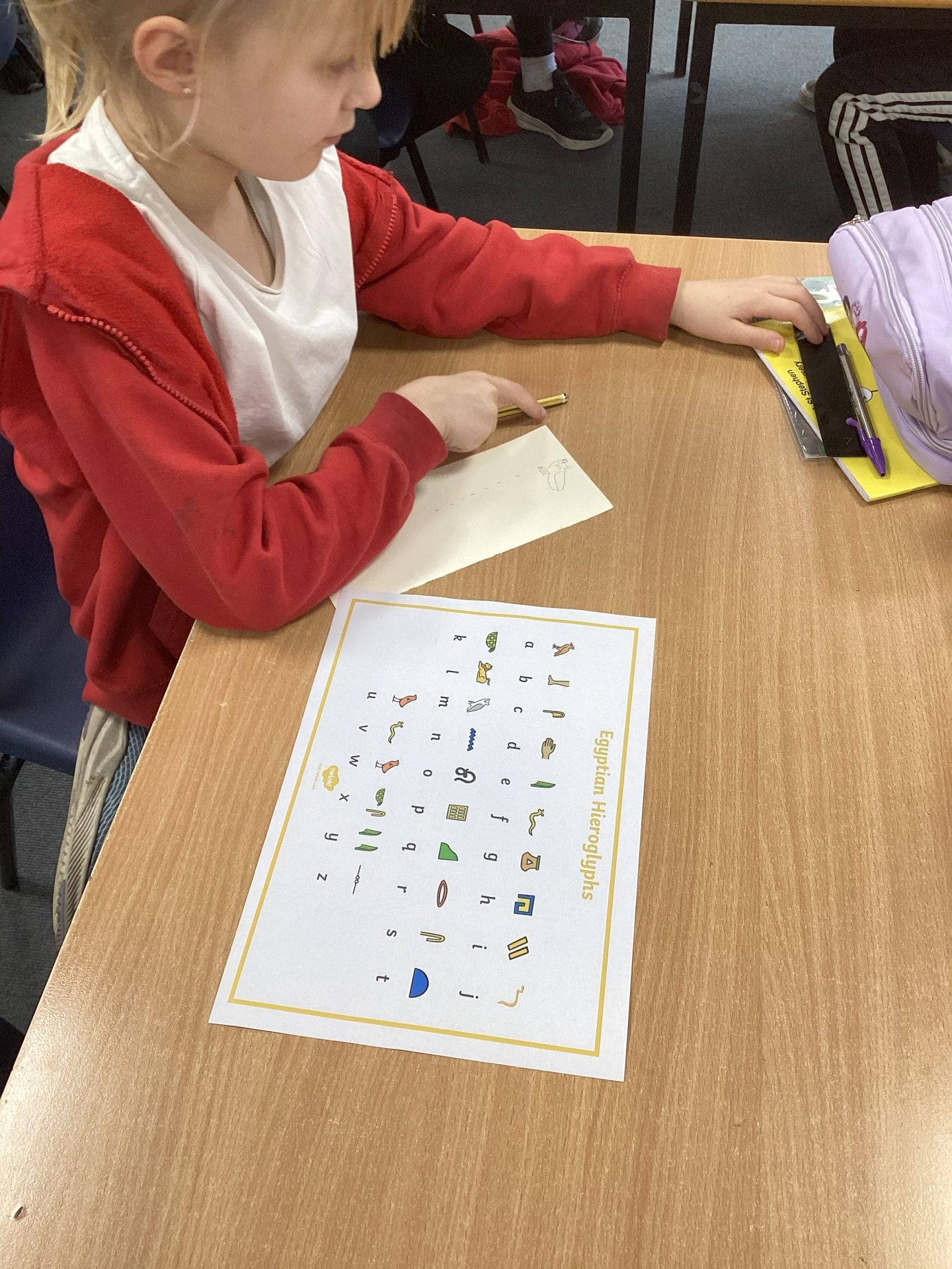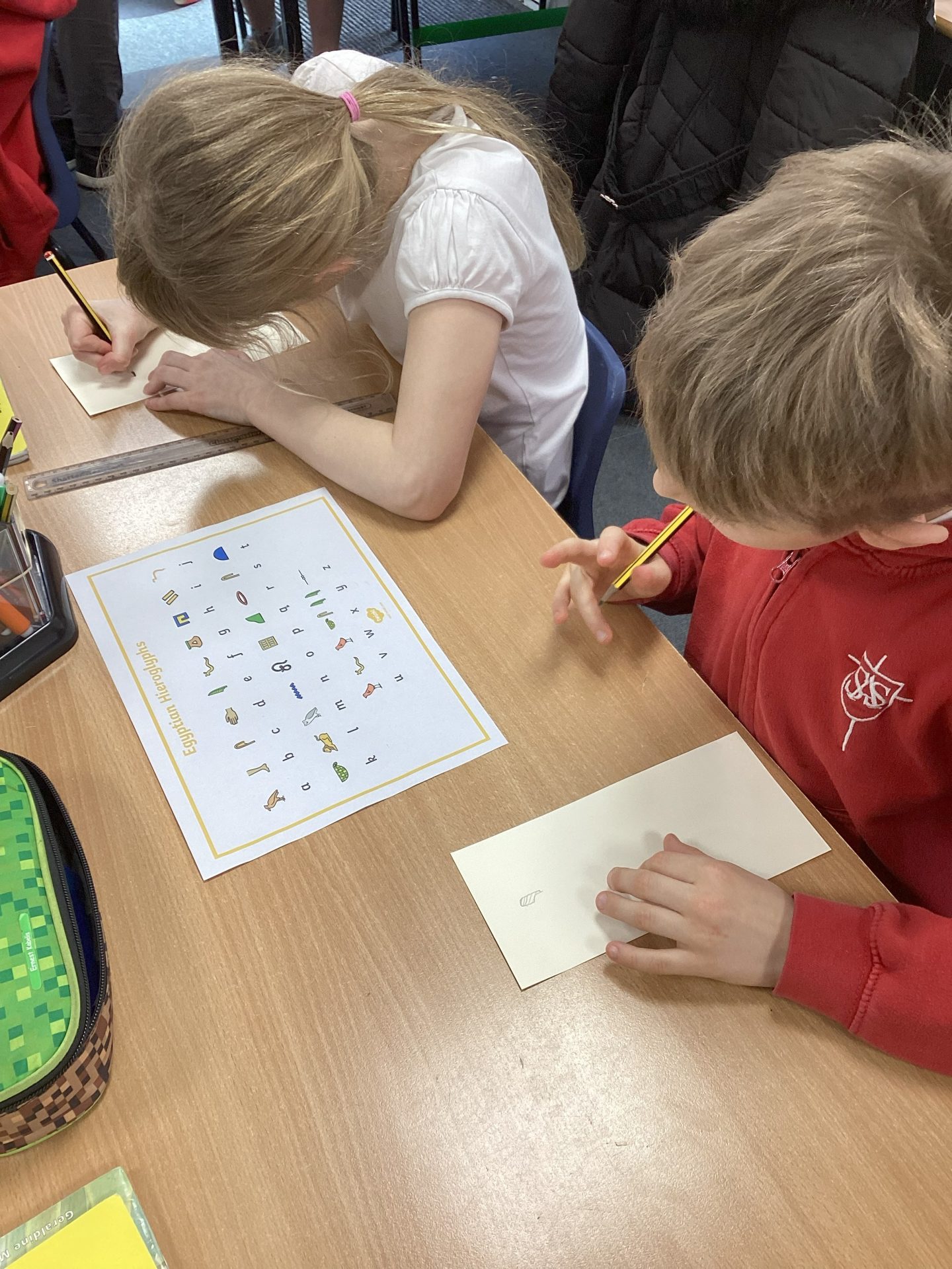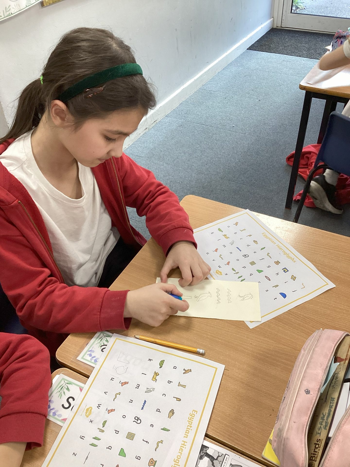 This week in our art lesson, we created Ancient Egyptian–style cartouches. We had previously studied Egyptian hieroglyphs, so we were able to use our knowledge of these ancient symbols to write our own names or the names of Egyptian gods and goddesses inside the cartouches. We carefully planned our designs and sketched them in pencil before going over the lines with black pen. Finally, we added shading and detail to create a three-dimensional effect, bringing our cartouches to life and helping us appreciate the art and writing of Ancient Egypt.