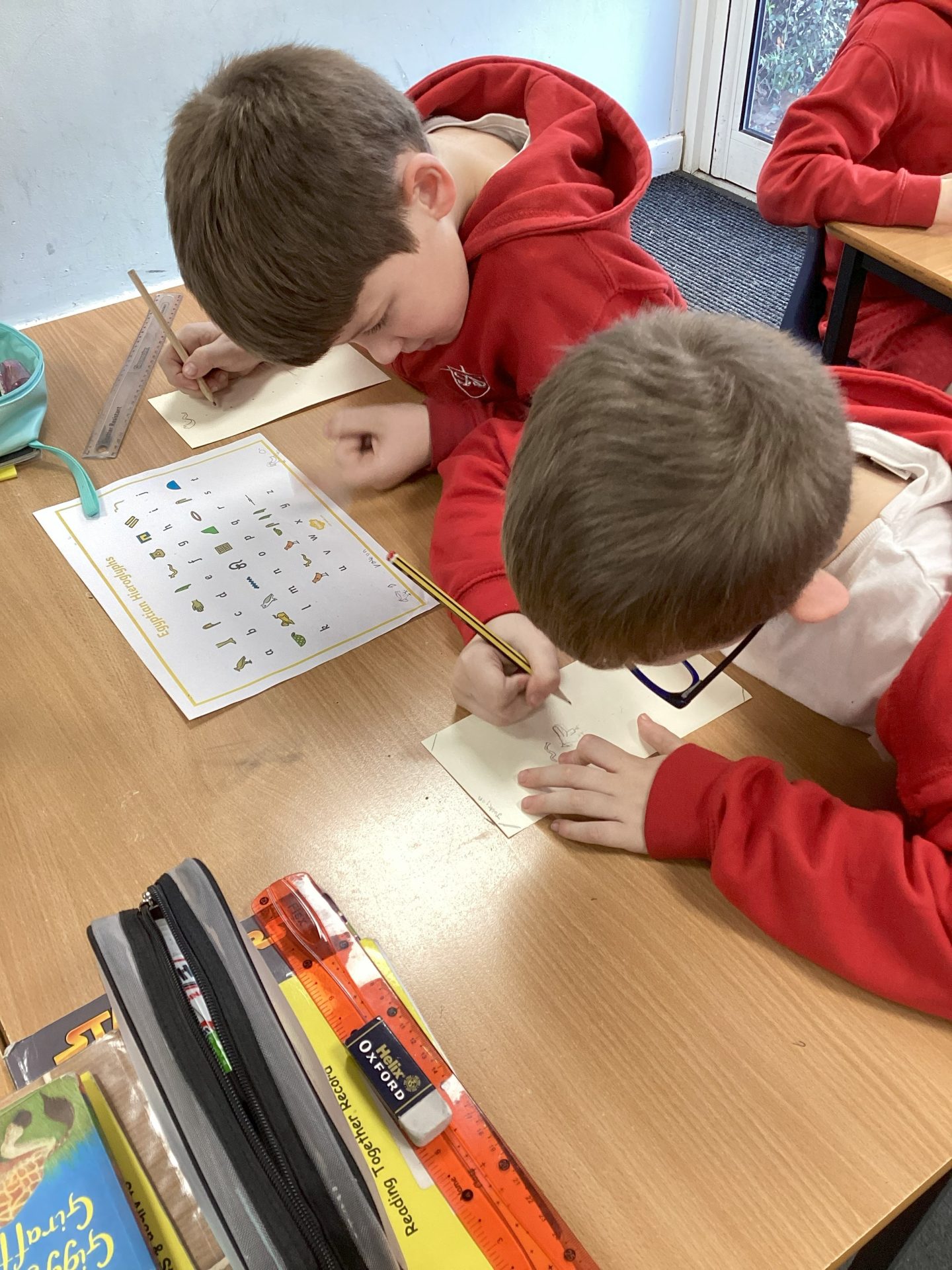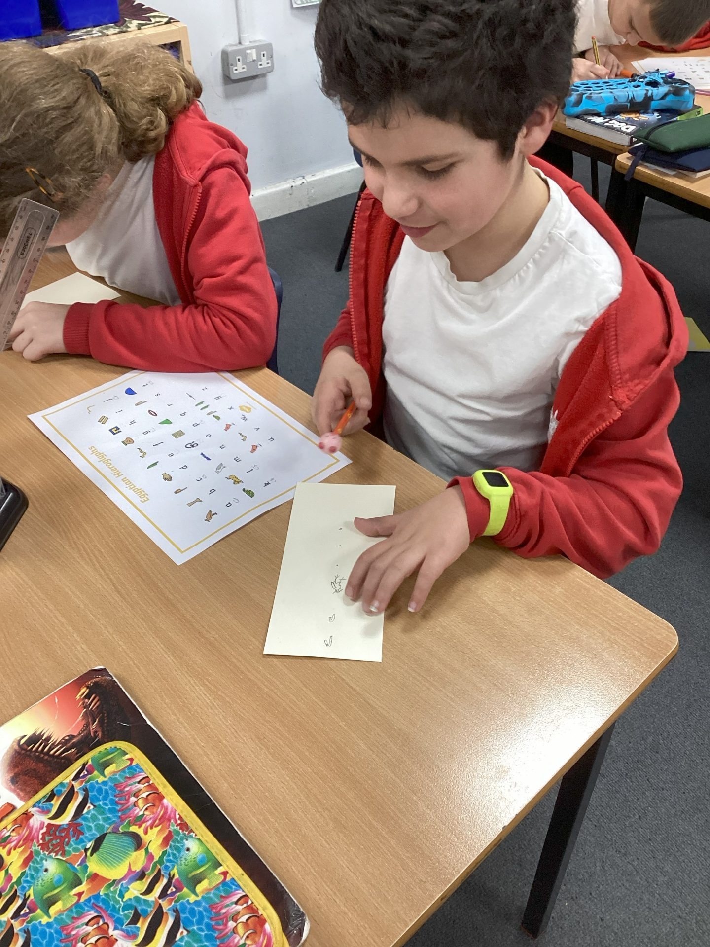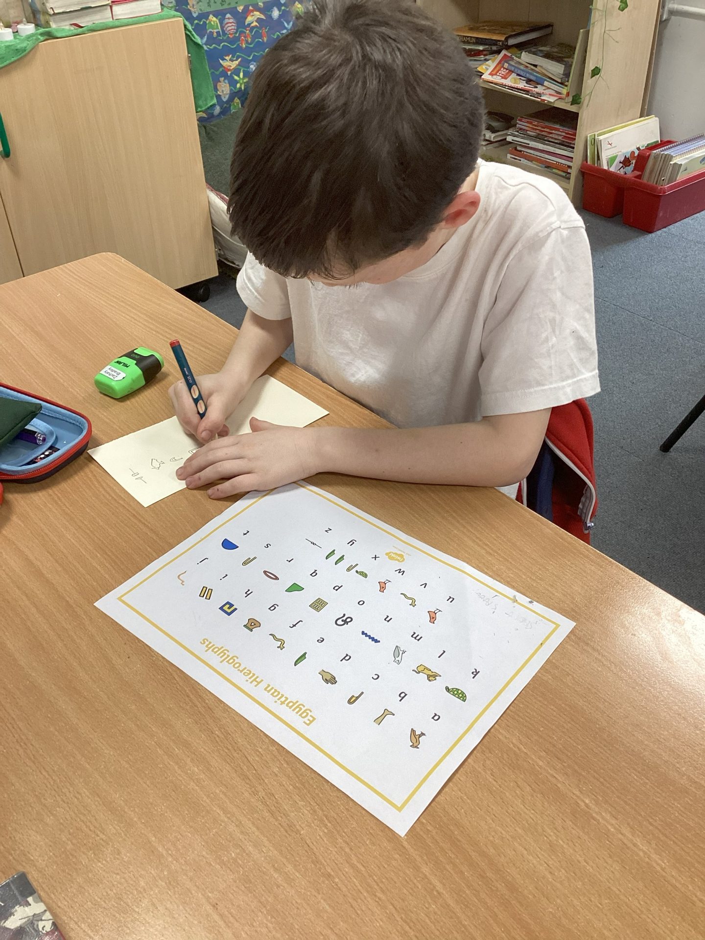 This week in our art lesson, we created Ancient Egyptian–style cartouches. We had previously studied Egyptian hieroglyphs, so we were able to use our knowledge of these ancient symbols to write our own names or the names of Egyptian gods and goddesses inside the cartouches. We carefully planned our designs and sketched them in pencil before going over the lines with black pen. Finally, we added shading and detail to create a three-dimensional effect, bringing our cartouches to life and helping us appreciate the art and writing of Ancient Egypt.