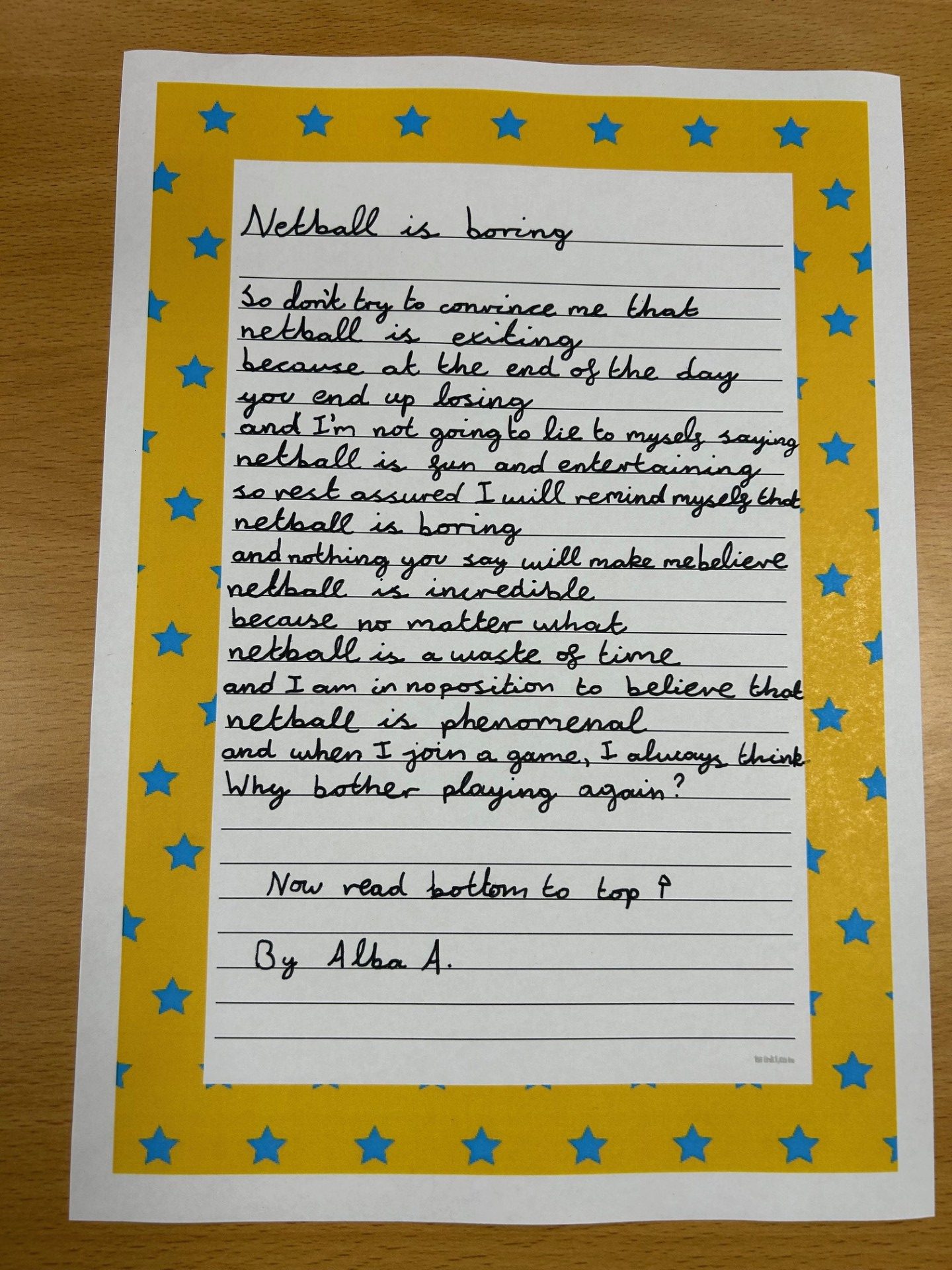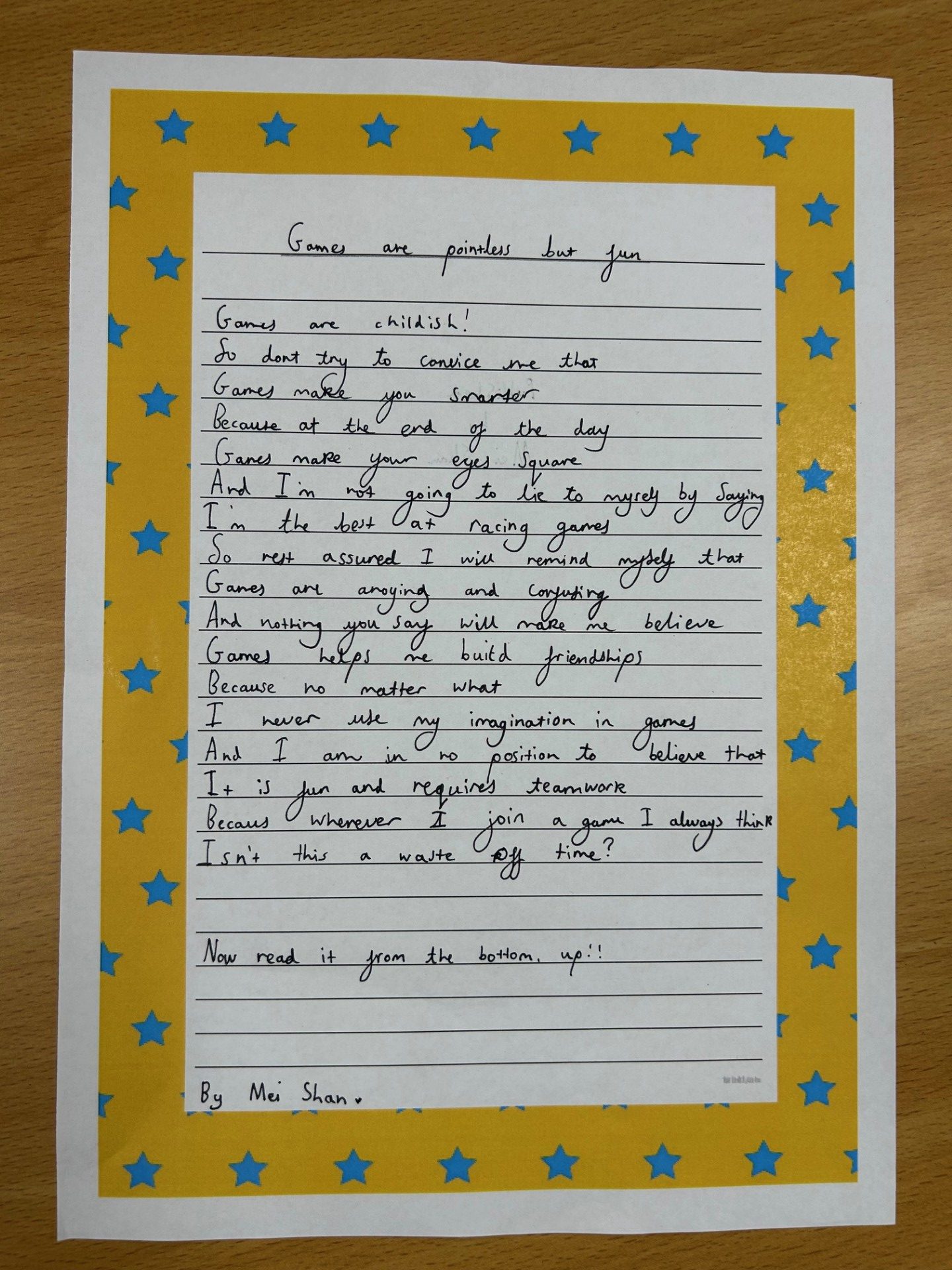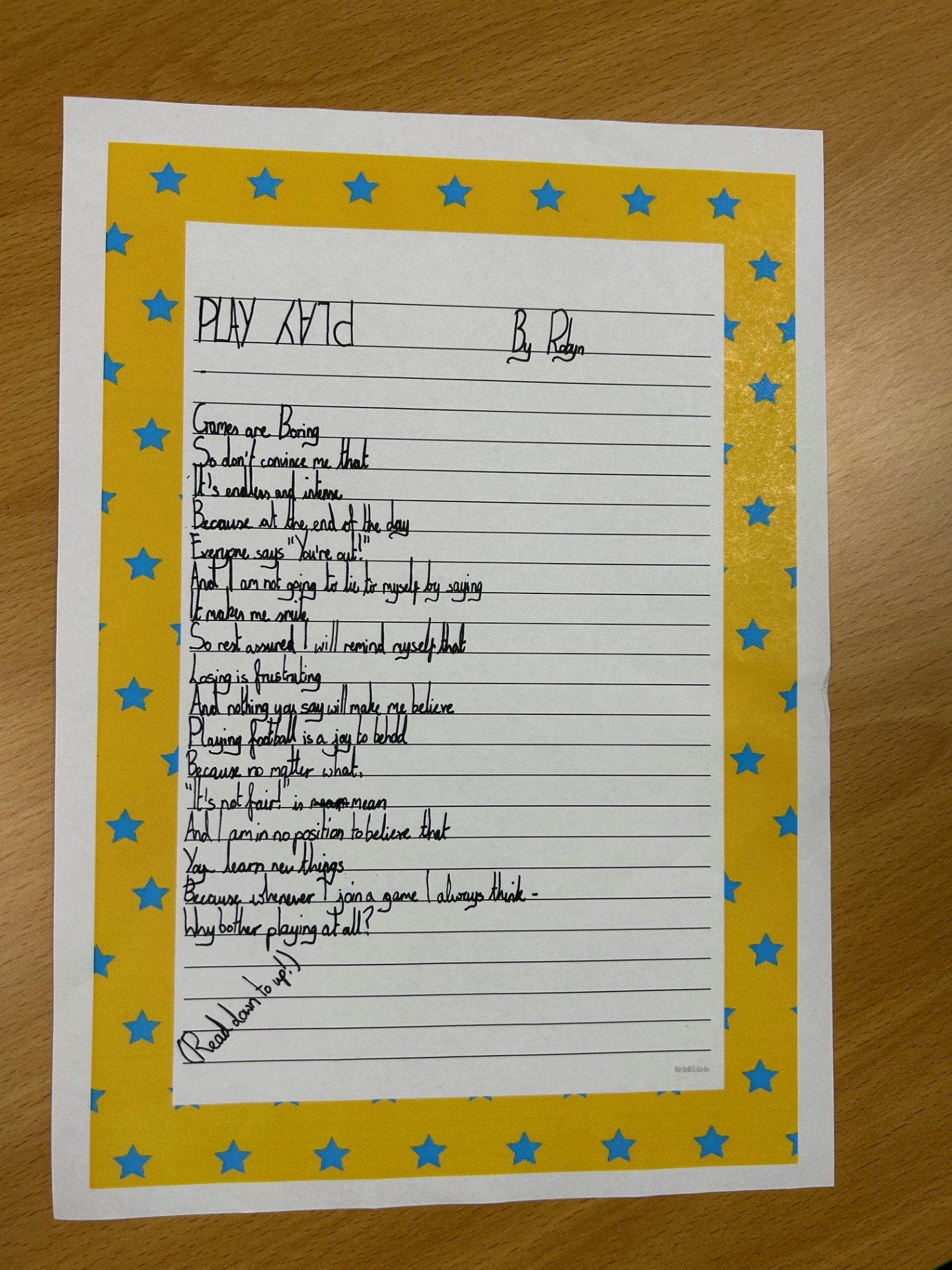 To mark the day, we had great fun playing with words and meanings by exploring reverse poems. These are amazing poems where, if you read them downwards, they can sound sad or negative, but if you read them upwards, the meaning flips to become happy and full of hope!