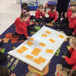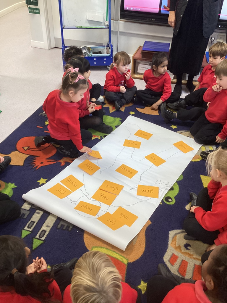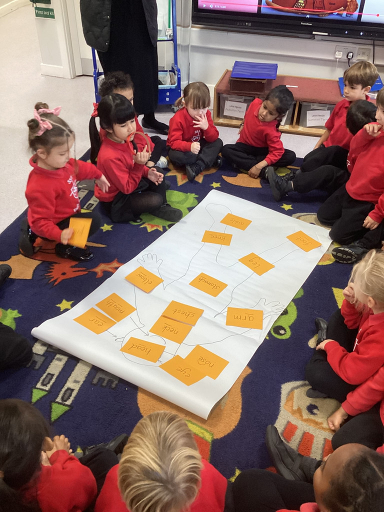 In Science, we’ve been learning about our amazing bodies! We worked together to draw around one another and then matched body part labels to the drawings.