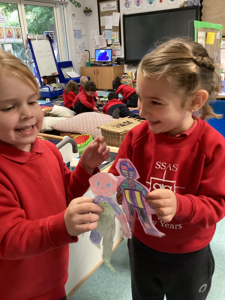 In RE, we’ve been learning all about baptism. We talked about our own baptism’s and those of our friends, then acted out a baptism through role play. We also listened to the story of Jesus’ baptism and made beautiful handprint doves to represent the Holy Spirit and becoming part of God’s family.