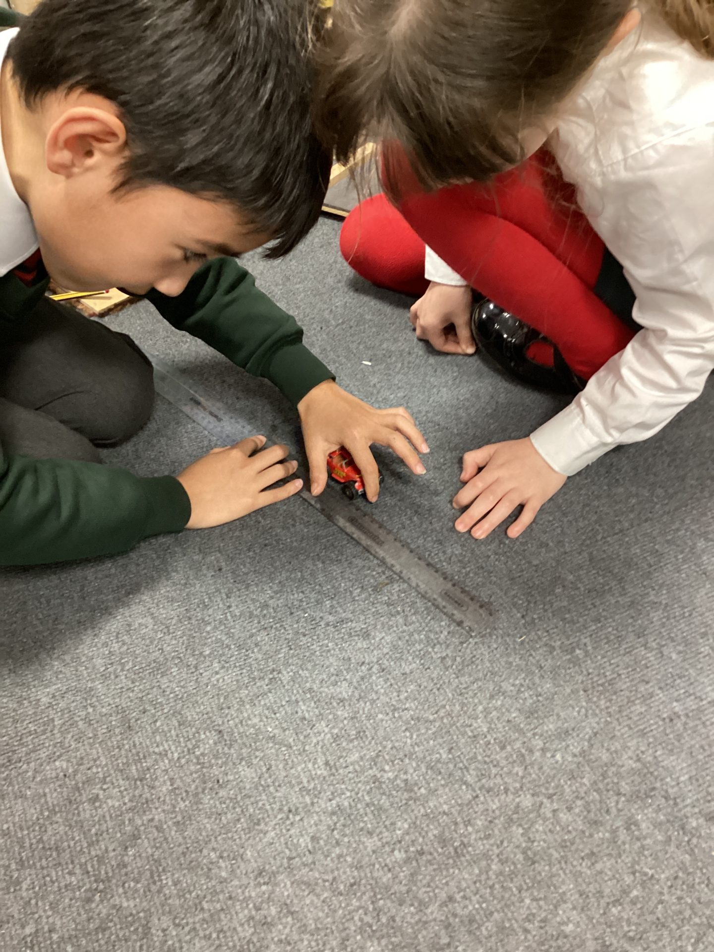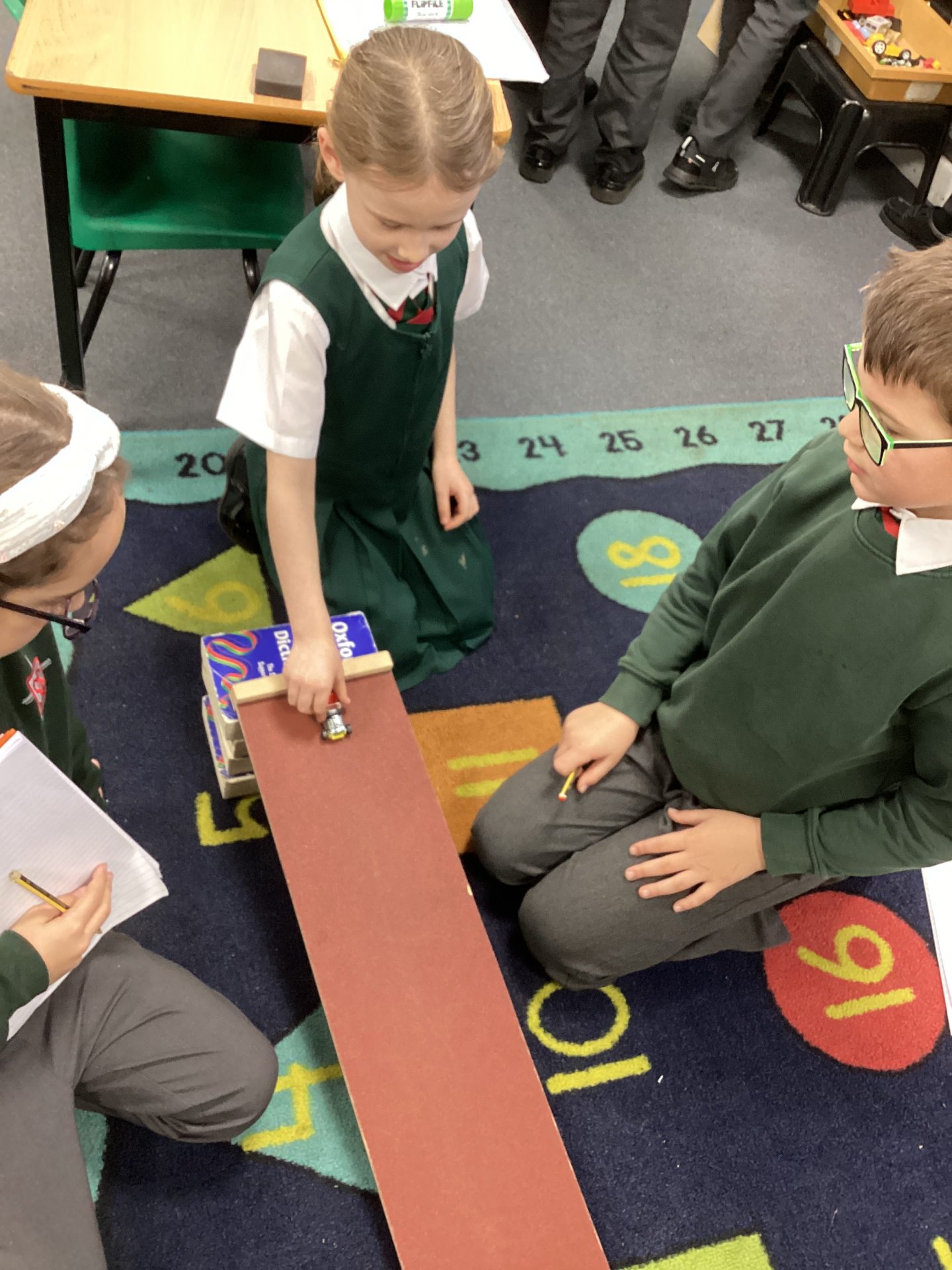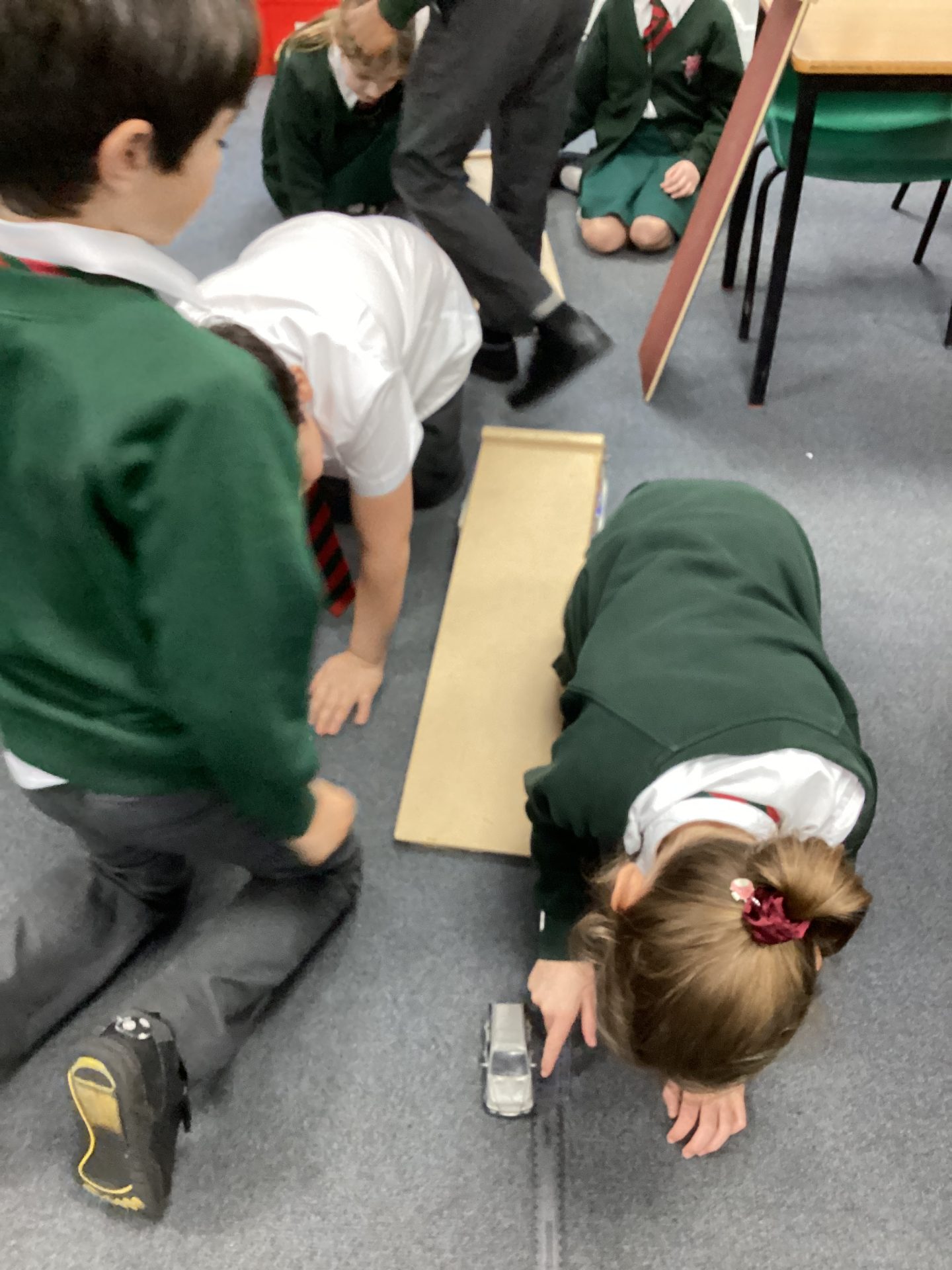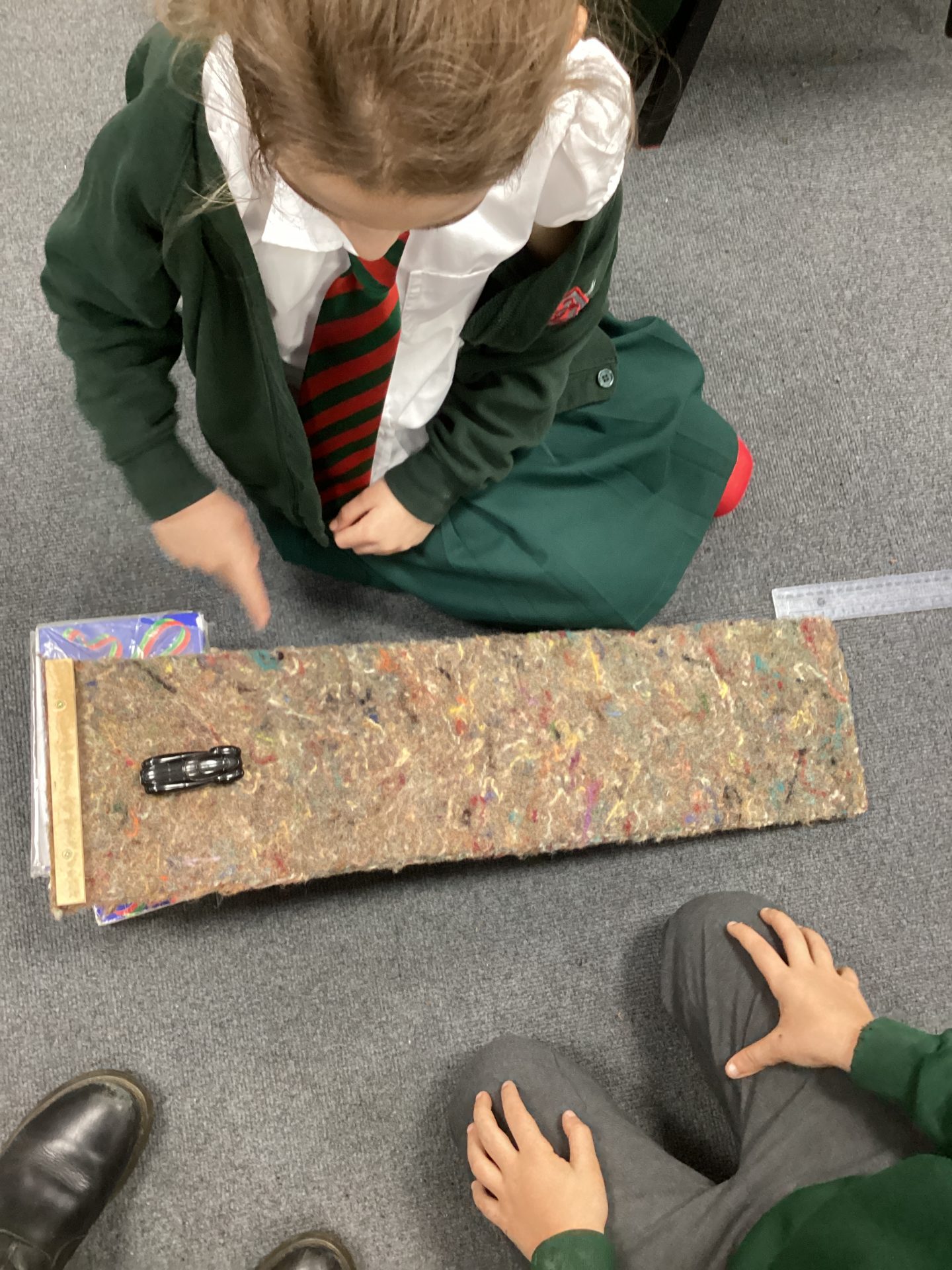 The children really enjoyed playing with toy cars this week as part of our science investigation into friction. We used various ramps covered in different materials to see how quickly or how slowly a toy car would run down them. If the surface was rough like carpet it produced a lot of friction and the car either stood still or travelled very slowly down the ramp. If the surface was smooth the toy car travelled quickly down the ramp.