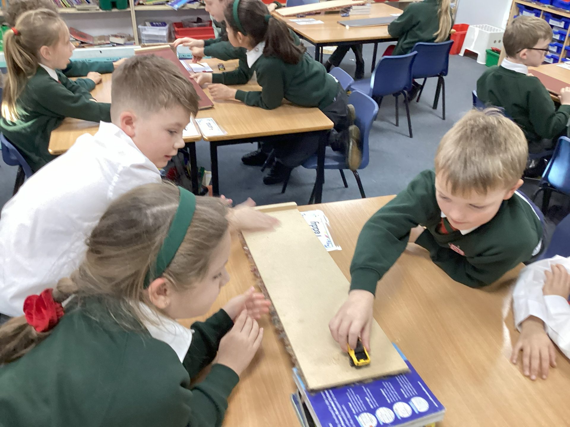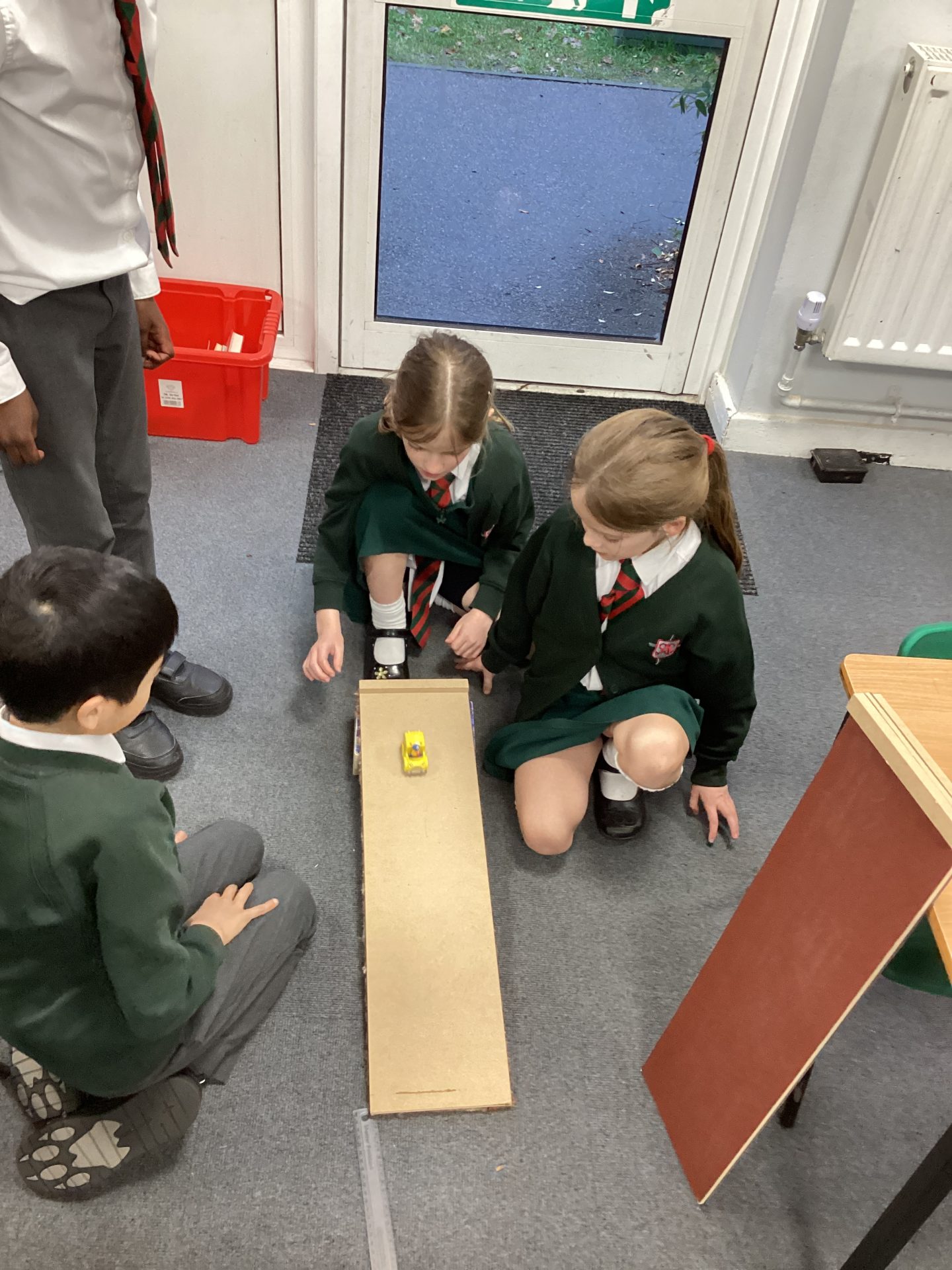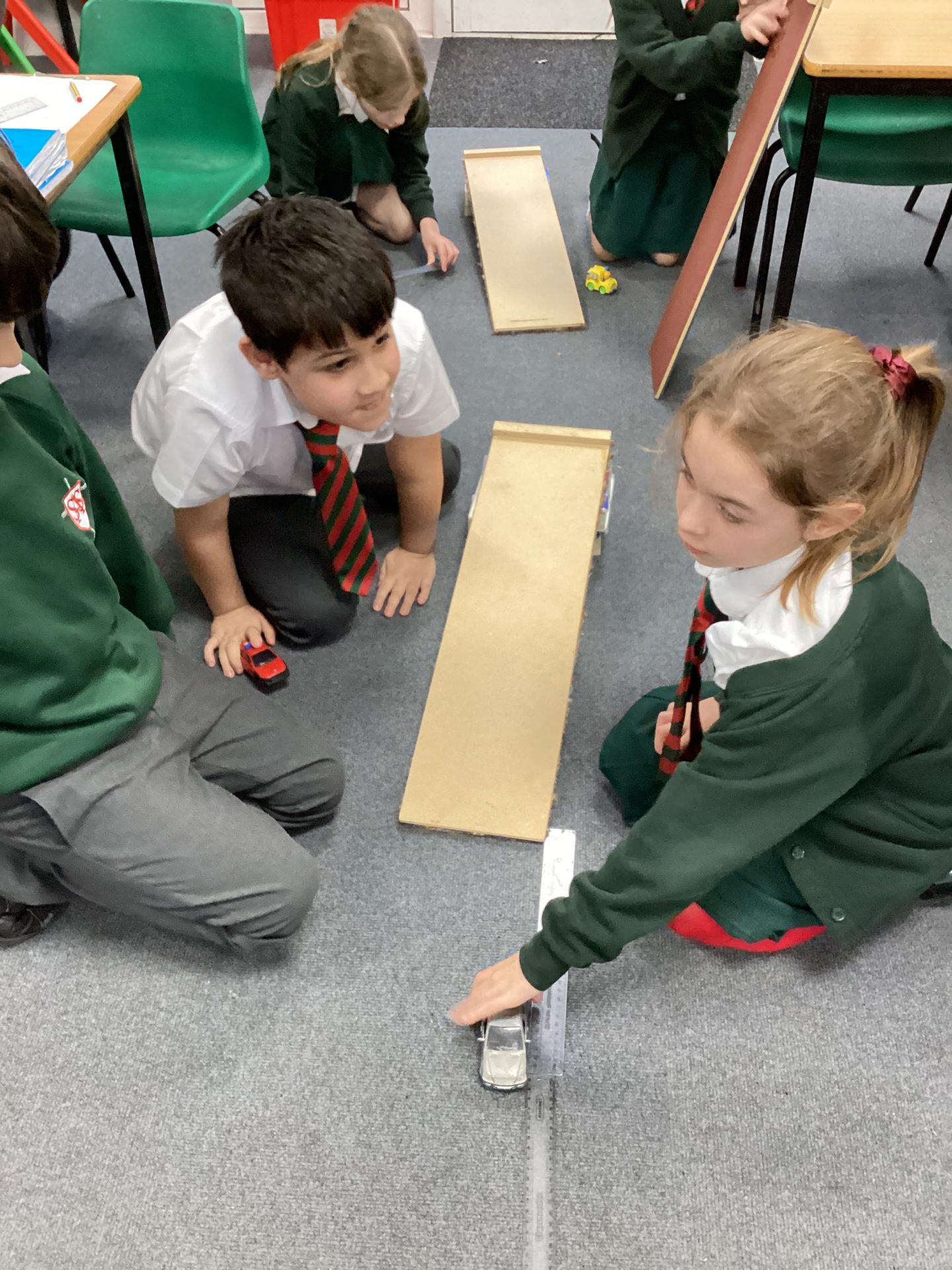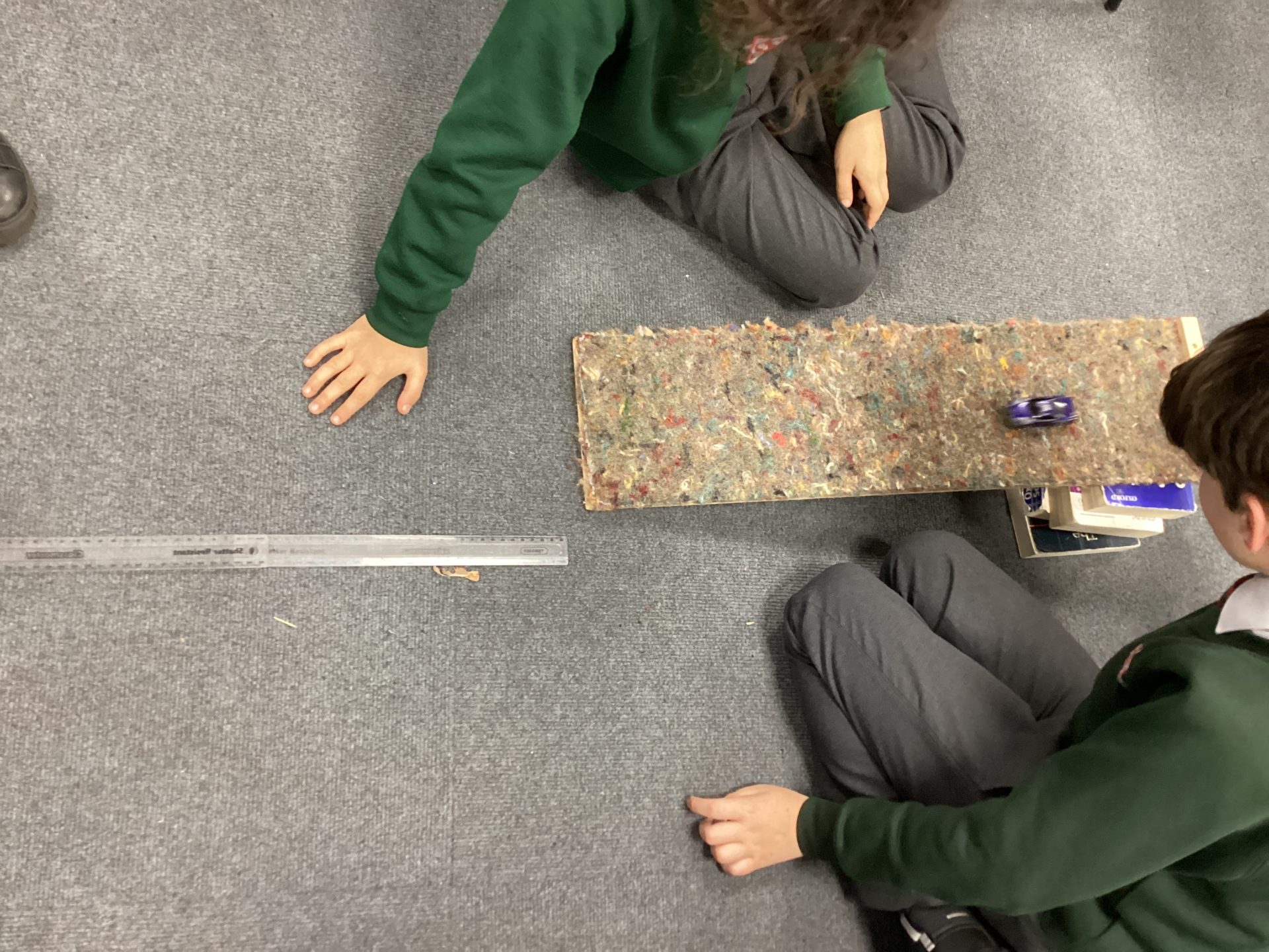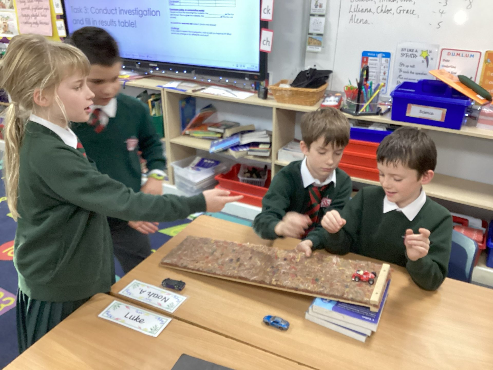 The children really enjoyed playing with toy cars this week as part of our science investigation into friction. We used various ramps covered in different materials to see how quickly or how slowly a toy car would run down them. If the surface was rough like carpet it produced a lot of friction and the car either stood still or travelled very slowly down the ramp. If the surface was smooth the toy car travelled quickly down the ramp.