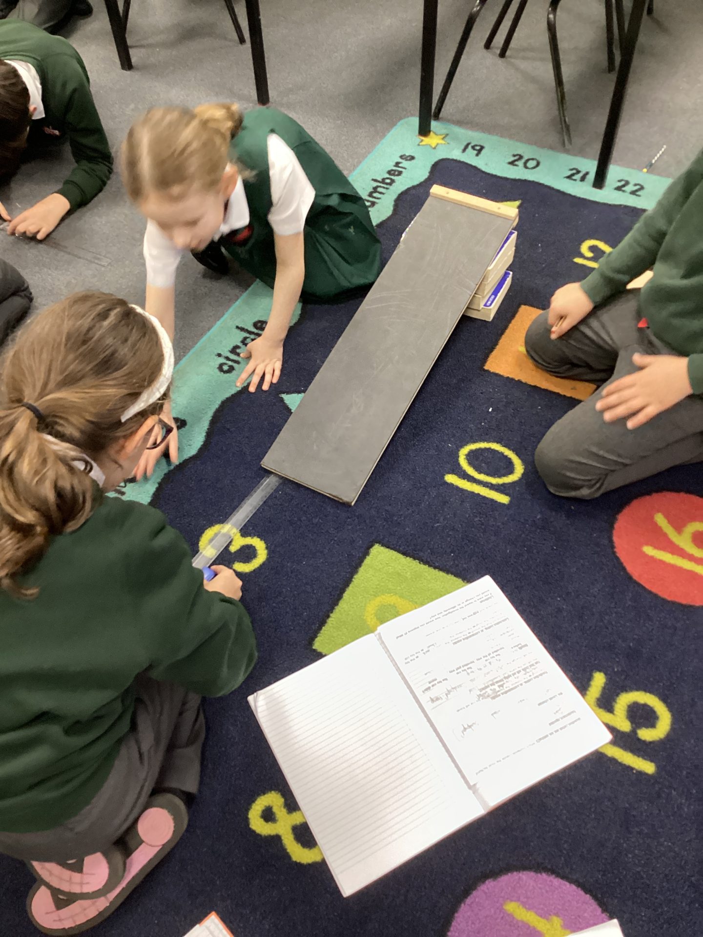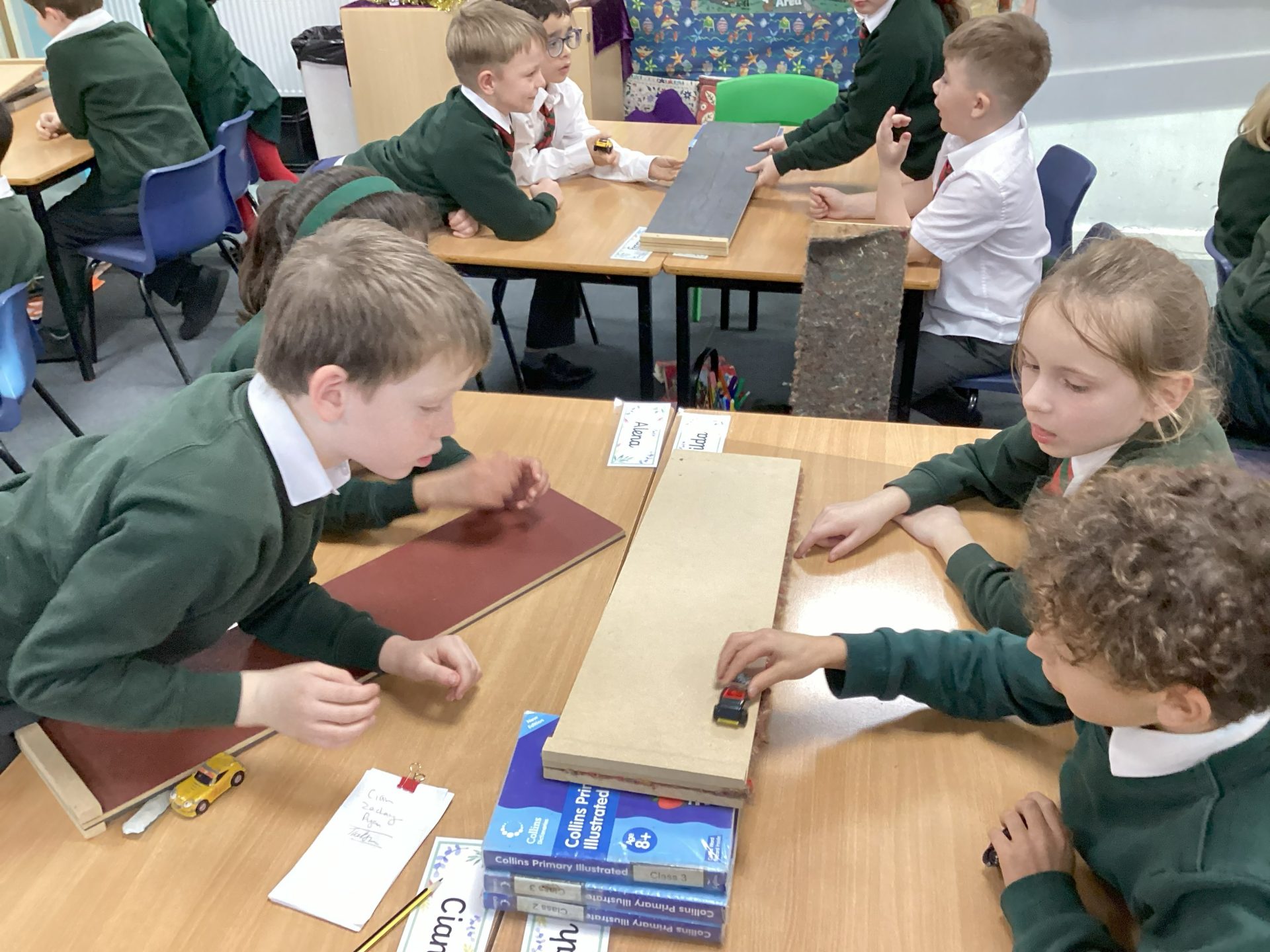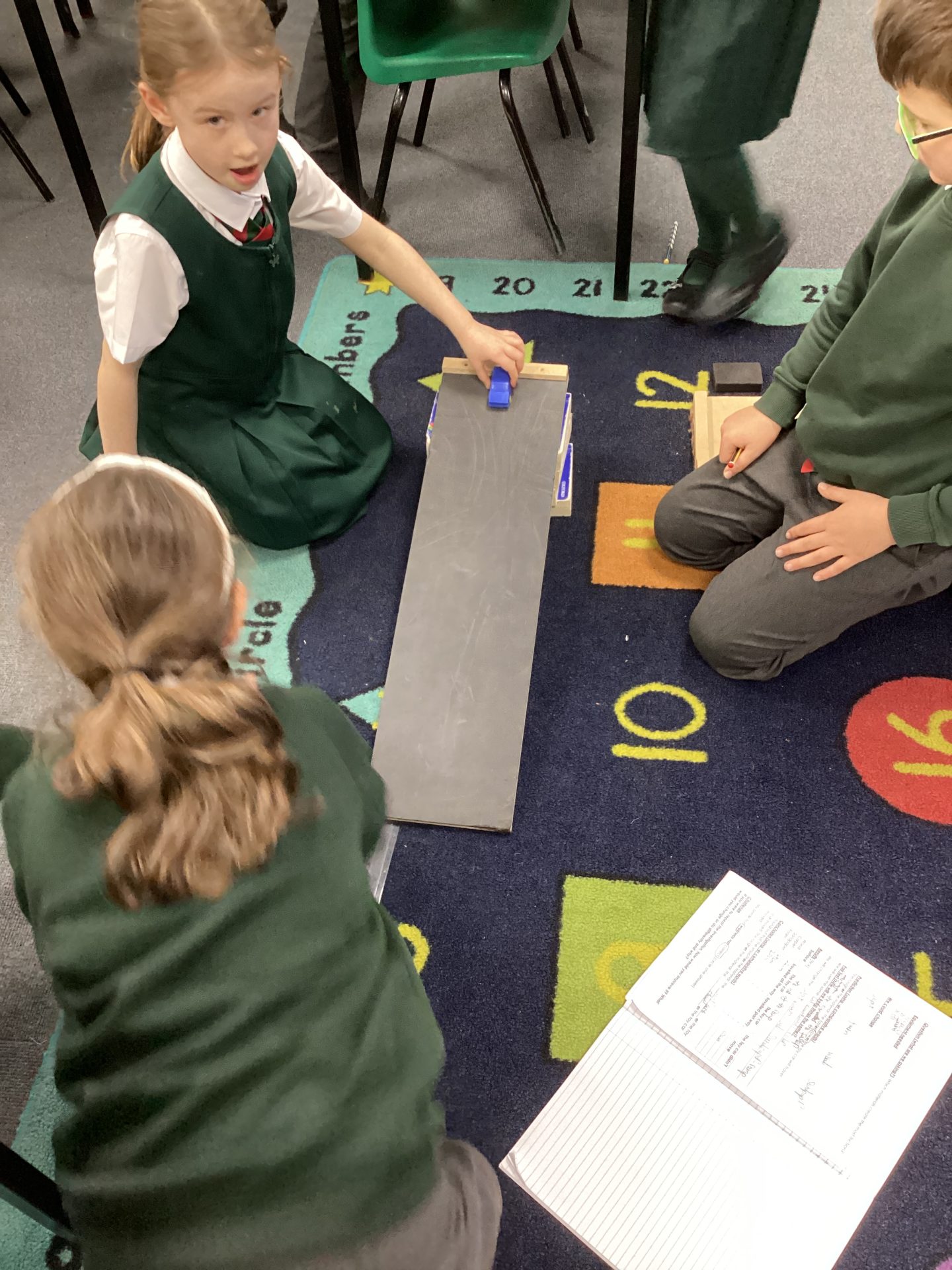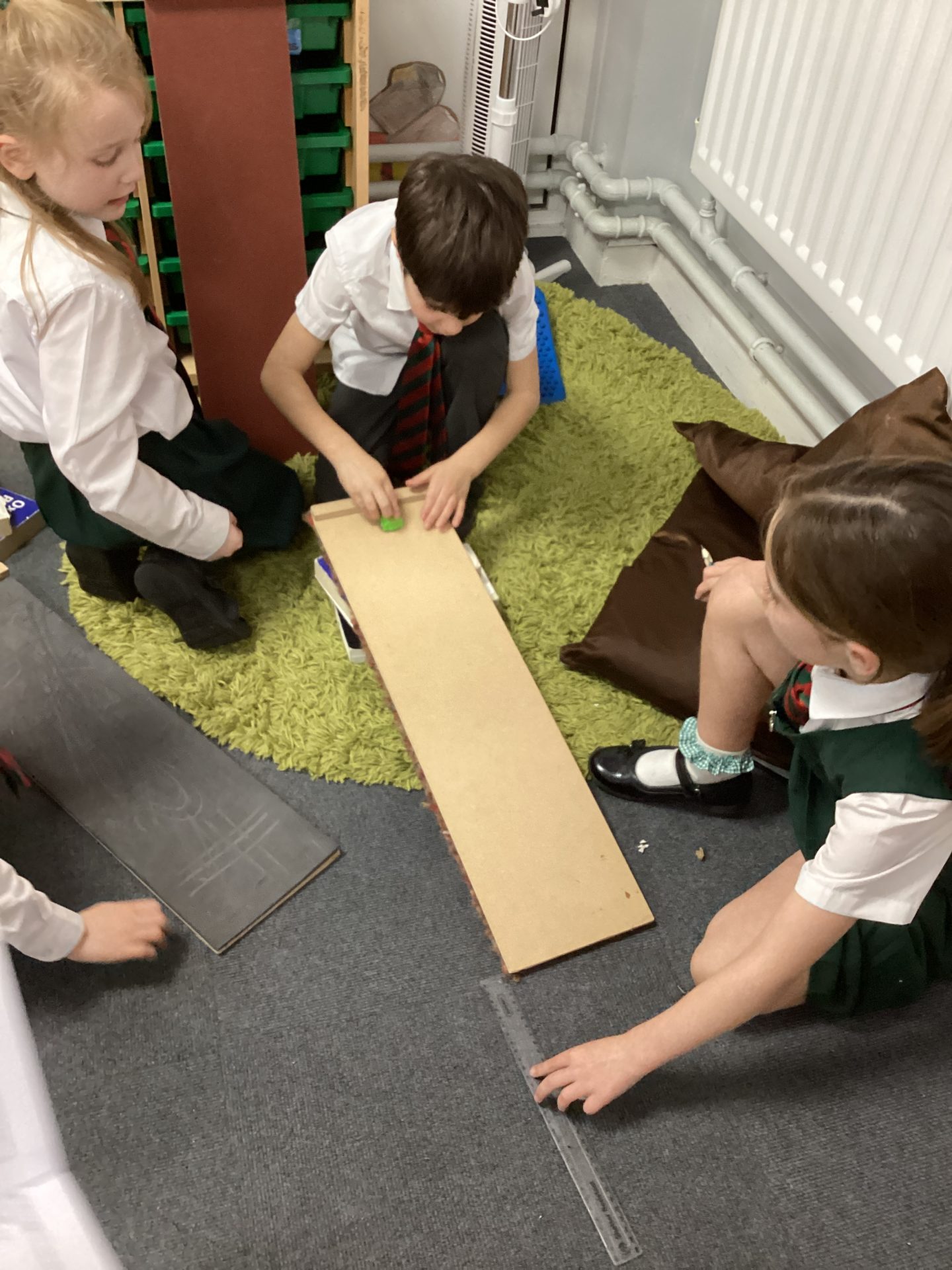 The children really enjoyed playing with toy cars this week as part of our science investigation into friction. We used various ramps covered in different materials to see how quickly or how slowly a toy car would run down them. If the surface was rough like carpet it produced a lot of friction and the car either stood still or travelled very slowly down the ramp. If the surface was smooth the toy car travelled quickly down the ramp.