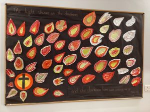 We created flames of light shining in the darkness, symbolising the ever present light of God. It will serve as a reminder to us this term that even when times are difficult, God’s light is always somewhere to be found.