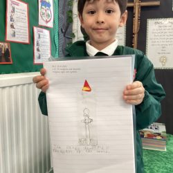 In RE, as our ‘Belonging’ topic comes to an end, the children have been thinking about religious signs and symbols. The children made their own baptismal candle and wrote what the candle represents.