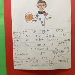 In History we have continued to learn about the History of space exploration. This week, we studied the life and amazing achievements of Neil Armstrong. He famously said when he landed on the moon in 1969; “This is one small step for a man, one giant leap for mankind”. We have continued to use the Role Play to use our imagination of space exploration and have created rockets and astronauts on paper and using the construction areas.